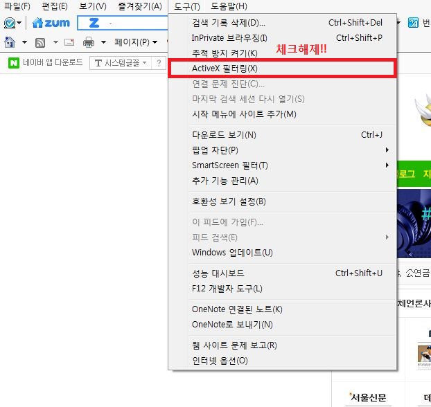 이용중이신 인터넷 익스플로러 브라우저 상단 [도구] 메뉴를 클릭합니다. (상단 메뉴 버튼이 보이시지 않는 경우 키보드 [Alt] 키를 누르시면 확인됩니다.) 메뉴의 항목 중 [ActiveX필터링] 항목에 v 체크 가 되어 있다면 체크를 해제하시기 바랍니다. 위의 방법으로도 문제가 해결되시지 않으실 경우,