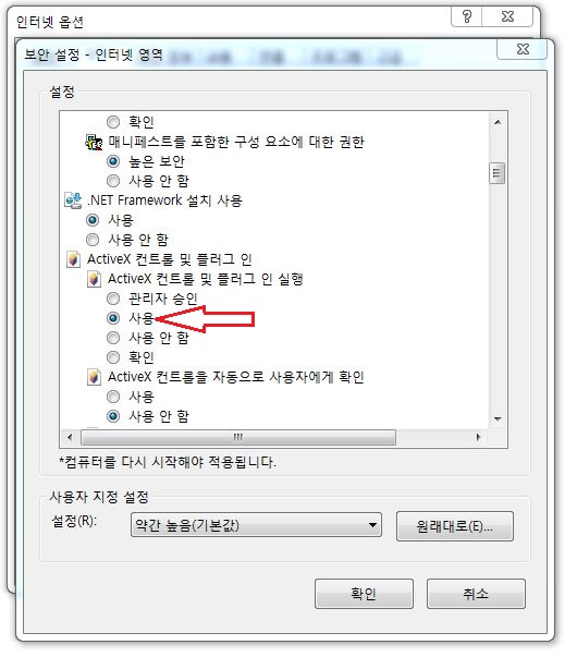 [사용자지정수준]에서 [ActiveX 컨트롤 및 플러그 인 실행] 항목을 찾습니다. 해당 항목이 [사용 안함] 으로 체크되어 있을 경우, [사용] 으로 체크를 변경하여 줍니다. 혹, 위의 모든 방법으로도 해결이 되지 않으시거나 직접 처리가 어려우신 경우 1661-0872 고객센터로 연락부탁드립니다. |